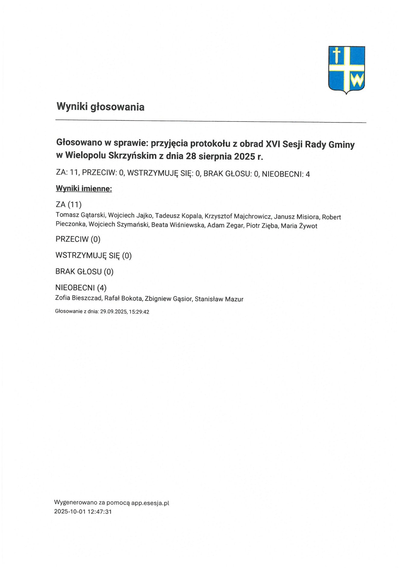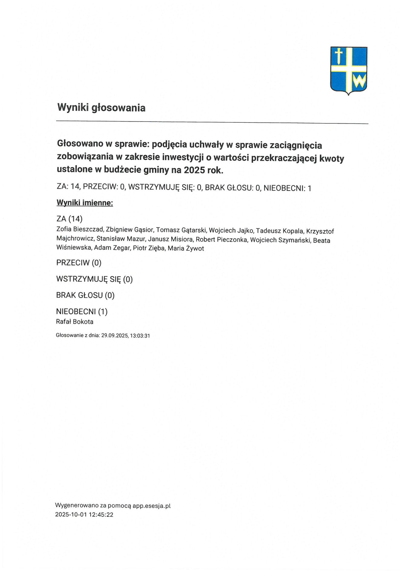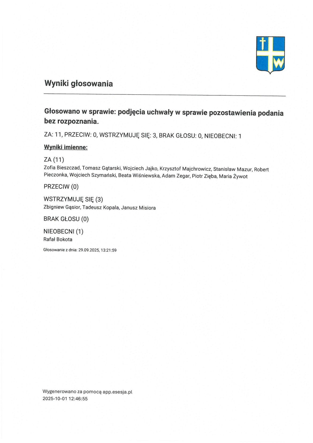 Środa 1 października 2025 Imienny wykaz głosowań radnych Strona Główna/Informator/InformacjeImienny wykaz głosowań radnychImienny wykaz głosowań radnych