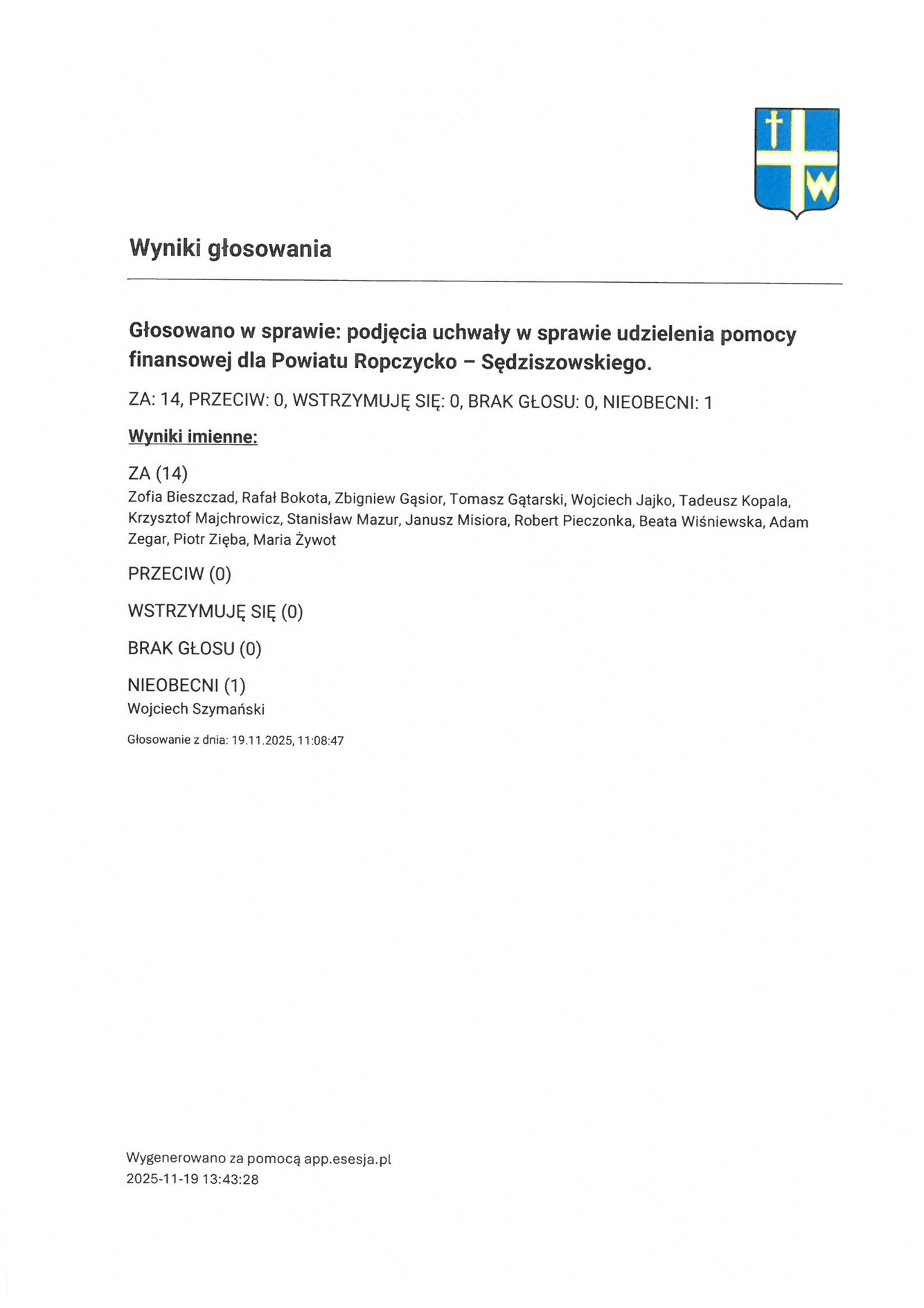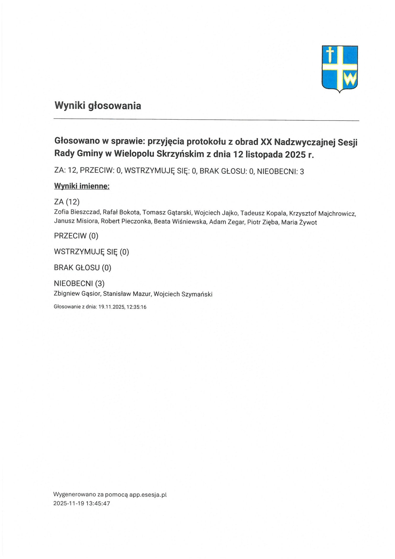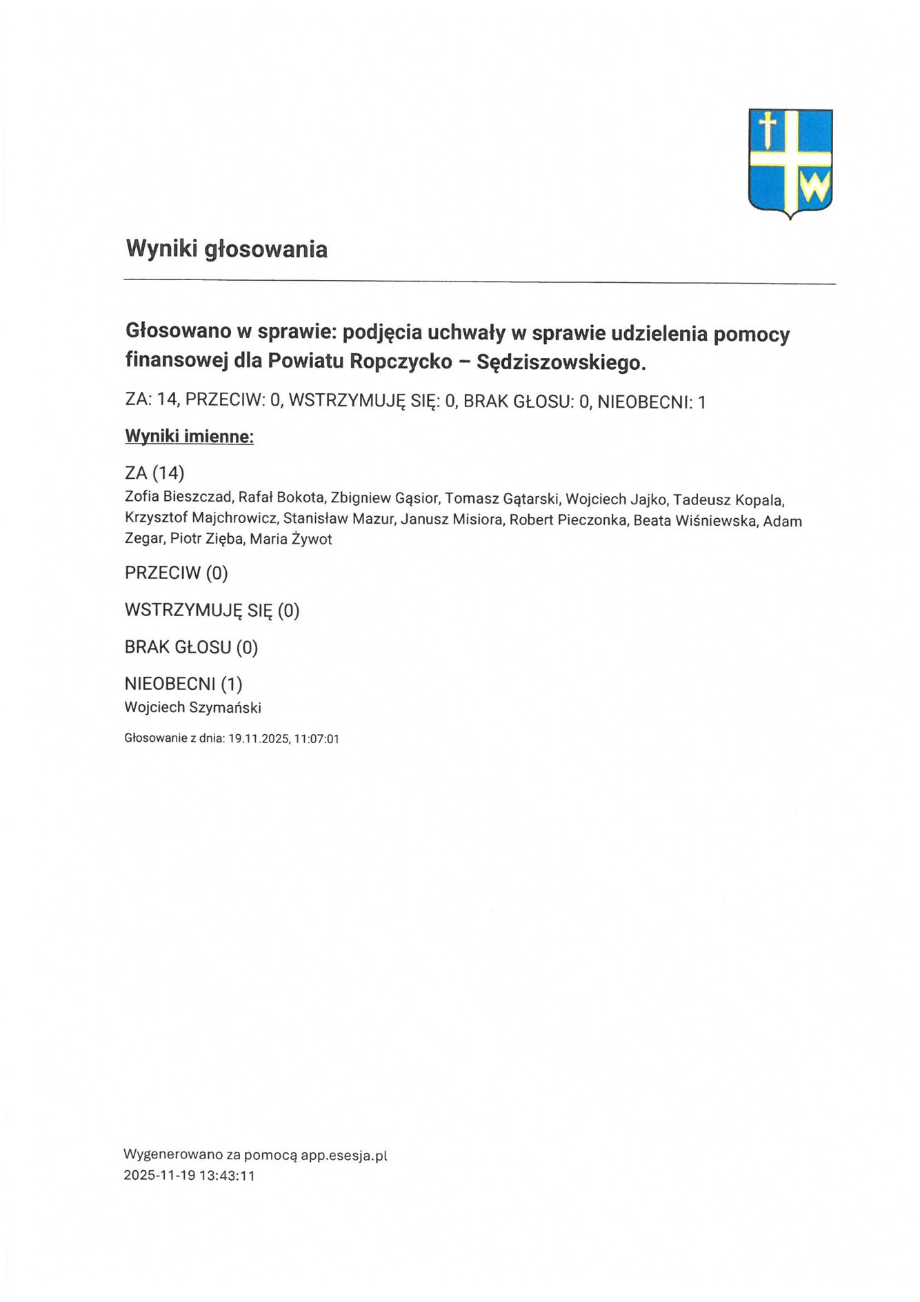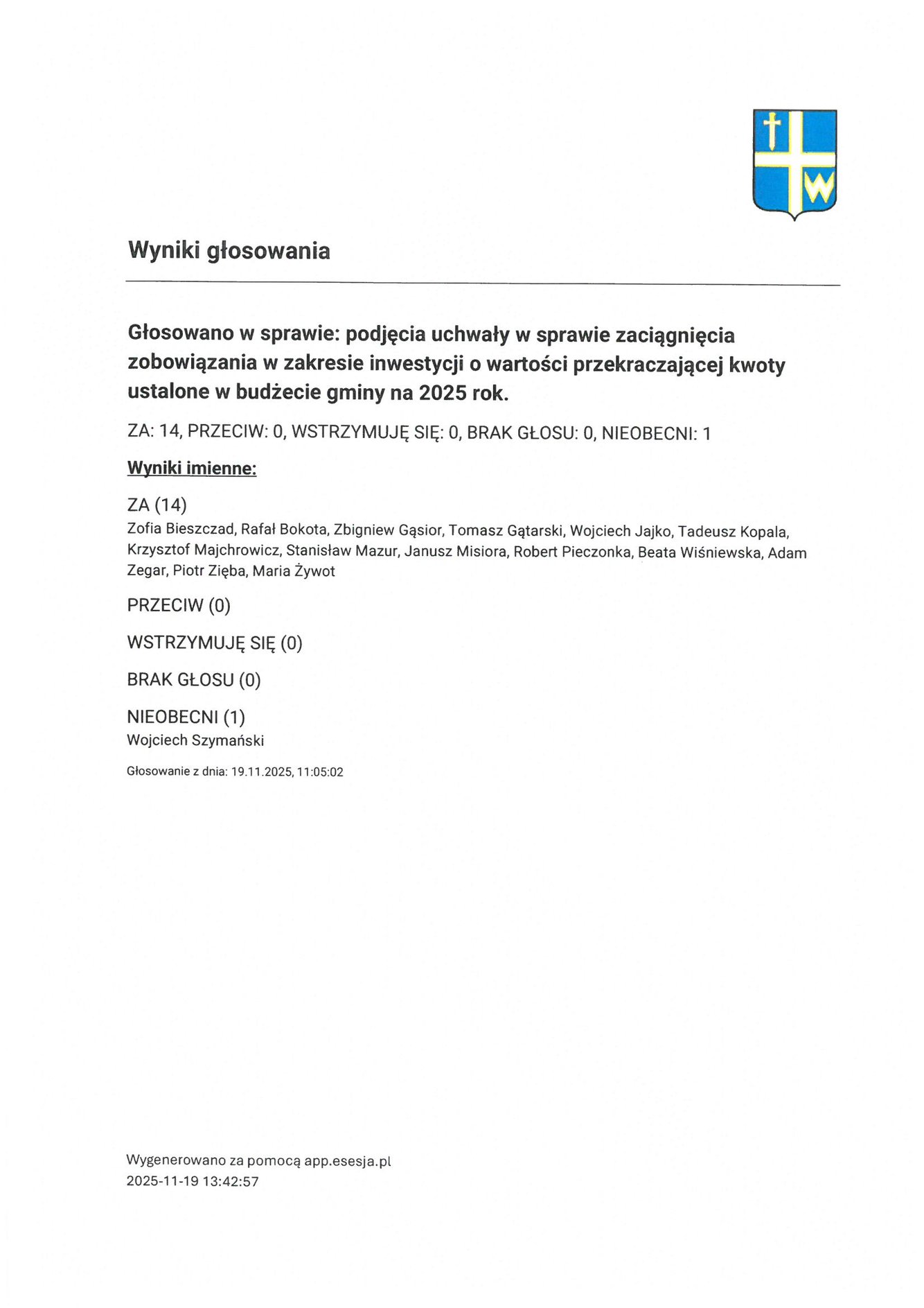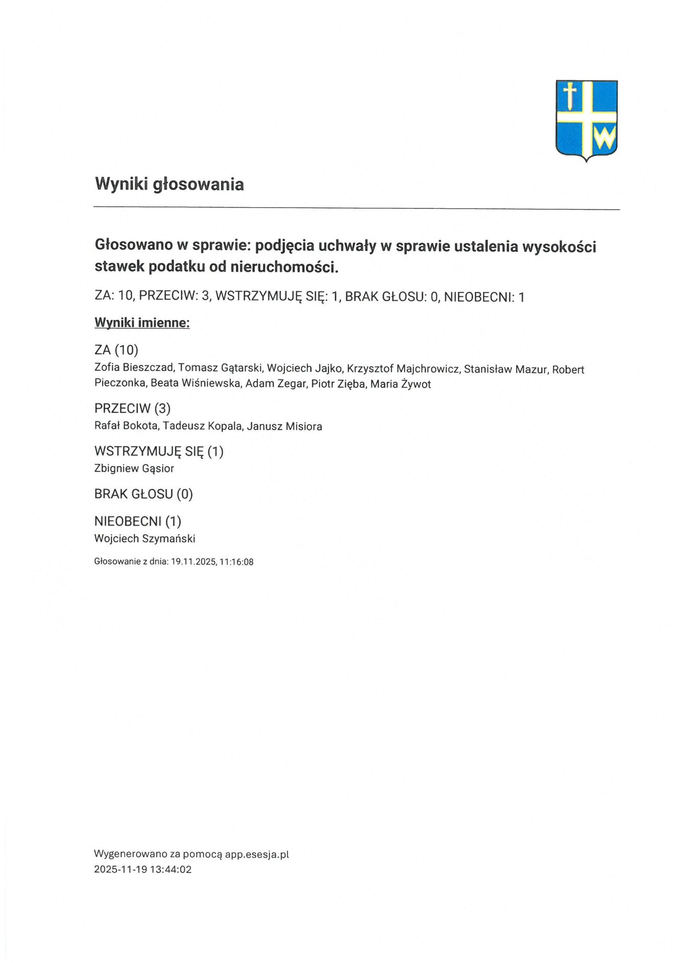 Czwartek 20 listopada 2025 Imienny wykaz głosowań radnych Strona Główna/Informator/InformacjeImienny wykaz głosowań radnychImienny wykaz głosowań radnych