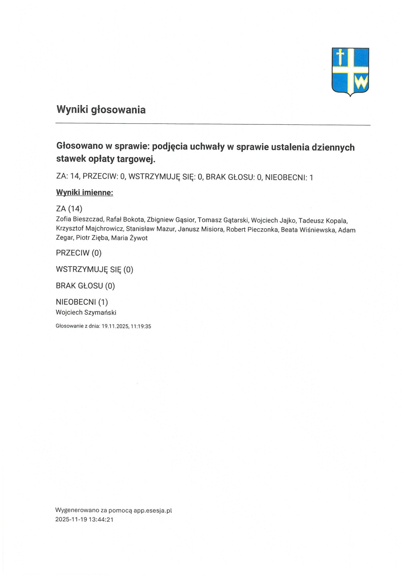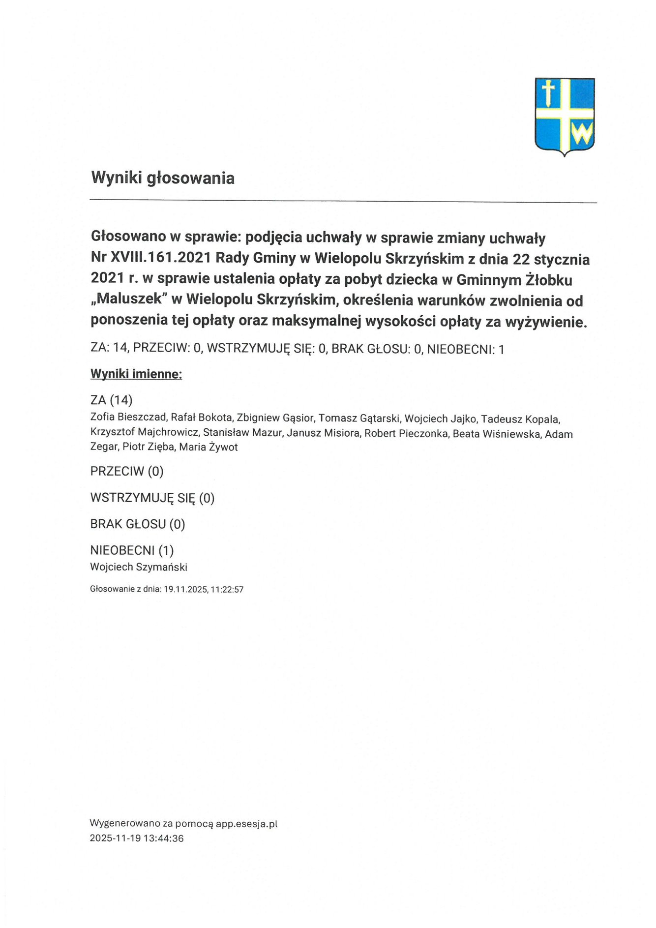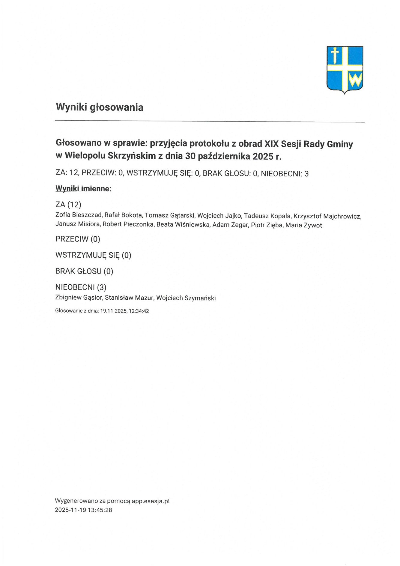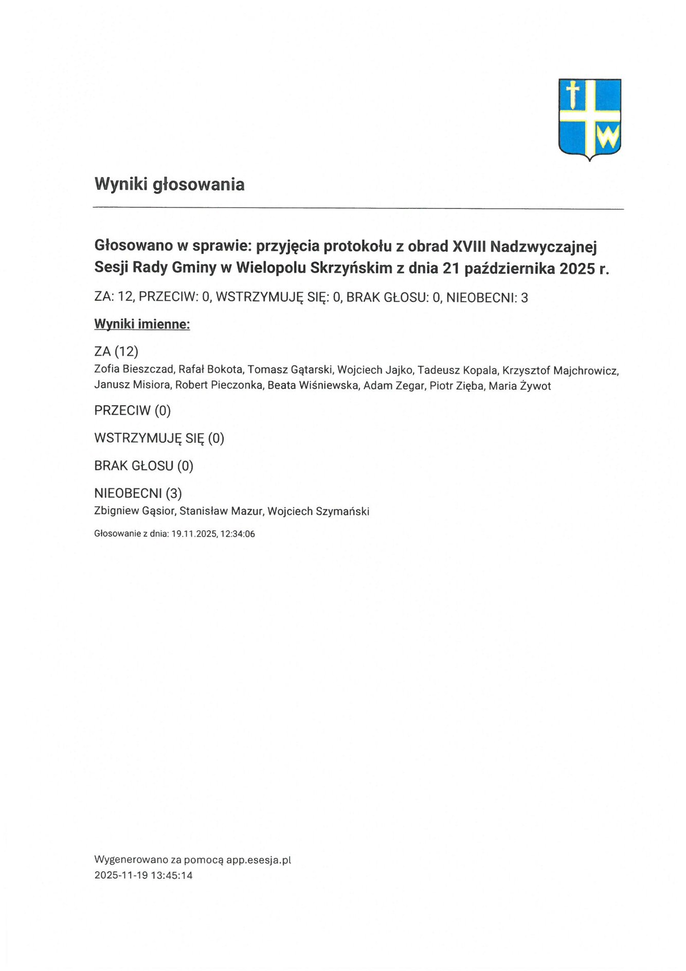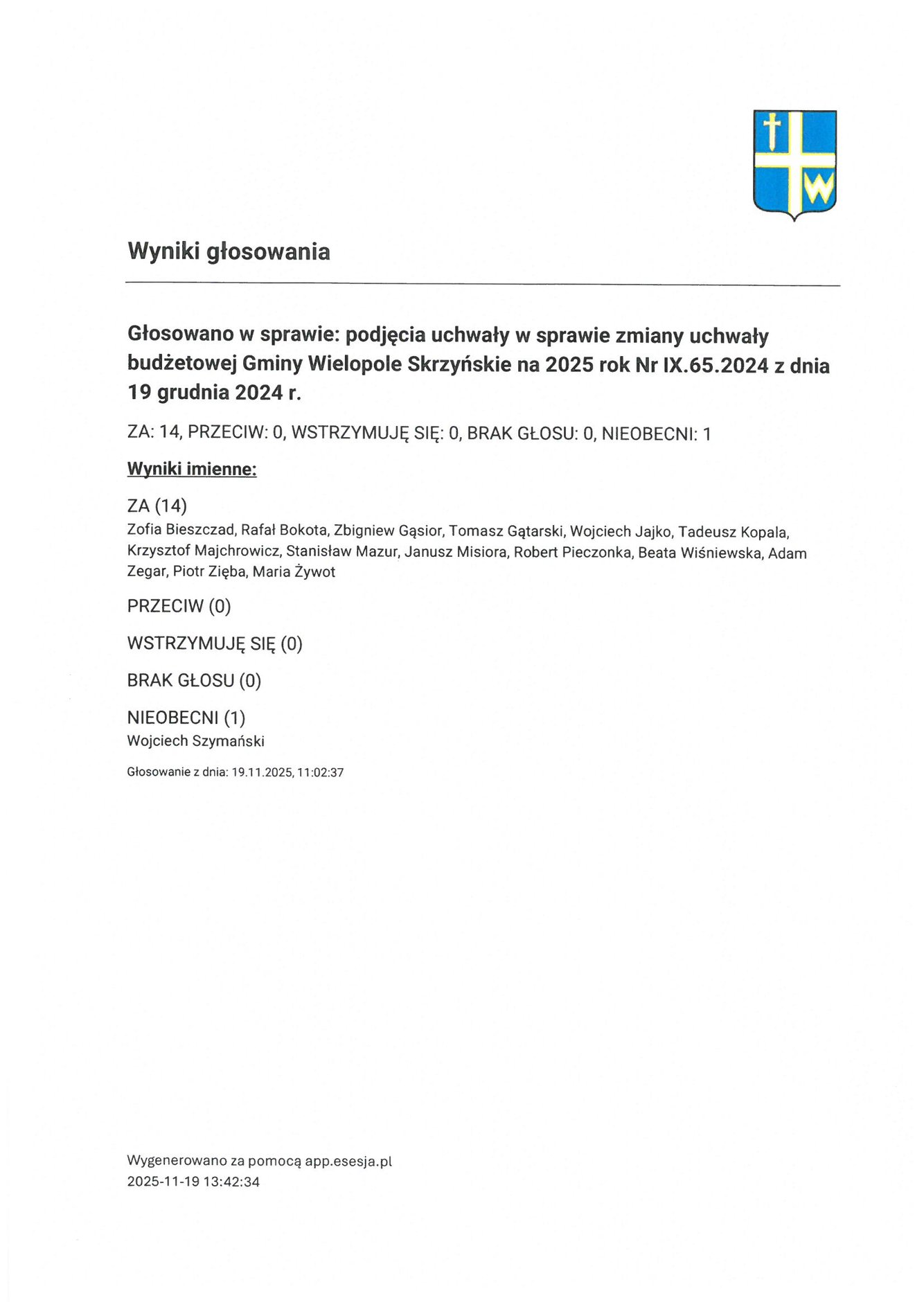 Czwartek 20 listopada 2025 Imienny wykaz głosowań radnych Strona Główna/Informator/InformacjeImienny wykaz głosowań radnychImienny wykaz głosowań radnych