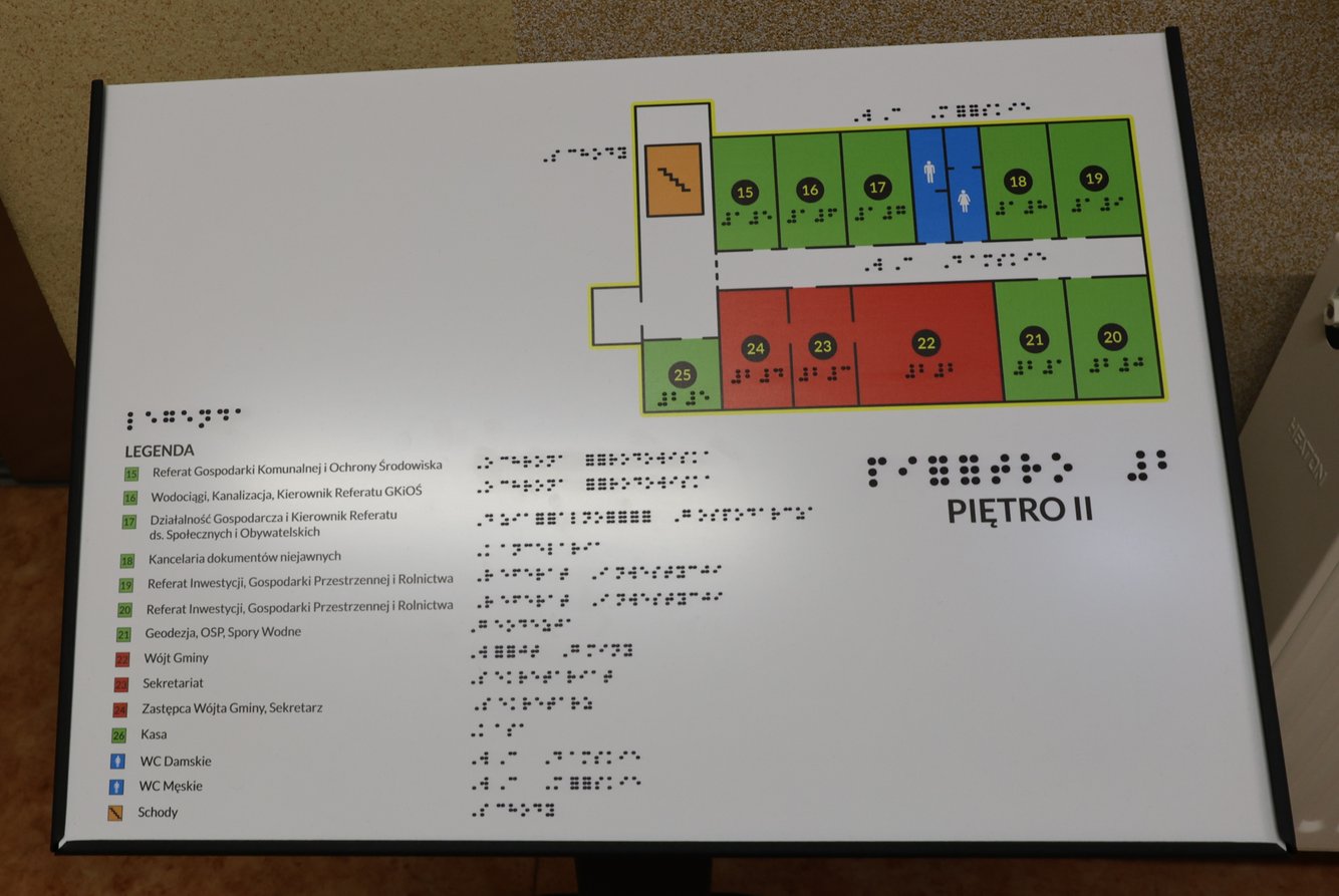 Dzięki nowym udogodnieniom osoby z problemami ze wzrokiem będą mogły łatwiej zorientować się w topografii Urzędu i korzystać z dostępnych zasobów informacyjnych, celem samodzielnego załatwienia poszczególnych spraw. Jest to kolejny krok w kierunku zwiększenia i uproszczenia dostępności usług publicznych świadczonych przez Urząd Gminy w Wielopolu Skrzyńskim, w szczególności dla osób z niepełnosprawnościami.