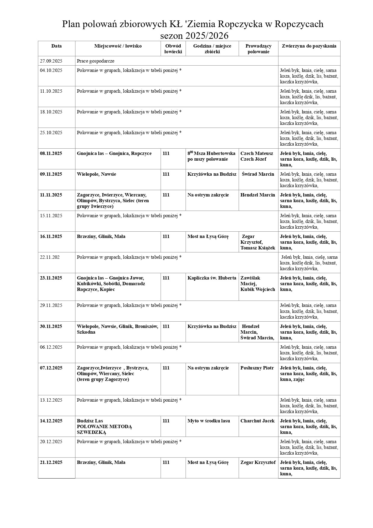 Zarząd Koła Łowieckiego Ziemia Ropczycka w Ropczycach informuje, że od 4 października br. zaplanowano polowania zbiorowe na terenie powiatu ropczycko-sędziszowskiego. Poniżej zamieszczamy plan polowań na sezon 2025/2026r.
