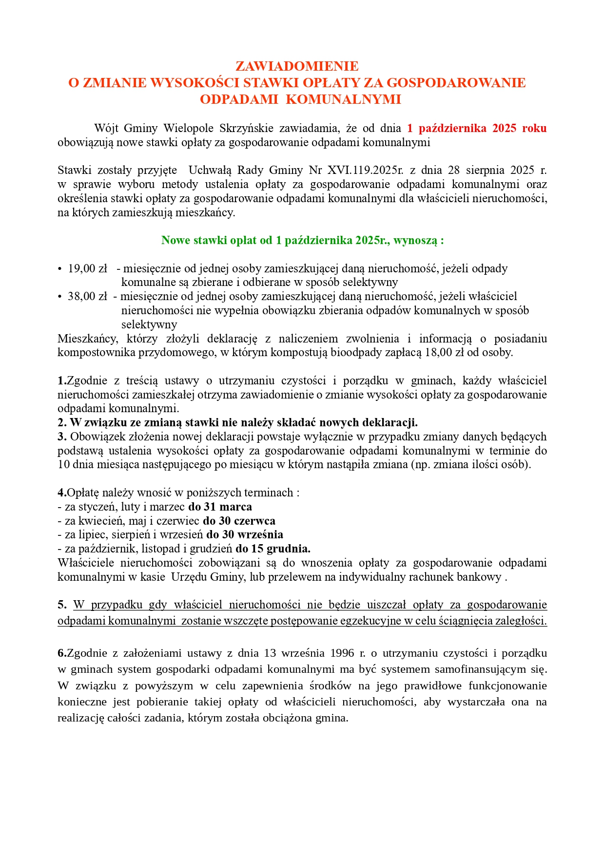 Czwartek 25 września 2025 ZAWIADOMIENIE O ZMIANIE WYSOKOŚCI STAWKI OPŁATY ZA GOSPODAROWANIE ODPADAMI KOMUNALNYMI Strona Główna/Biuletyn Informacji Publicznej/Gospodarka Komunalna